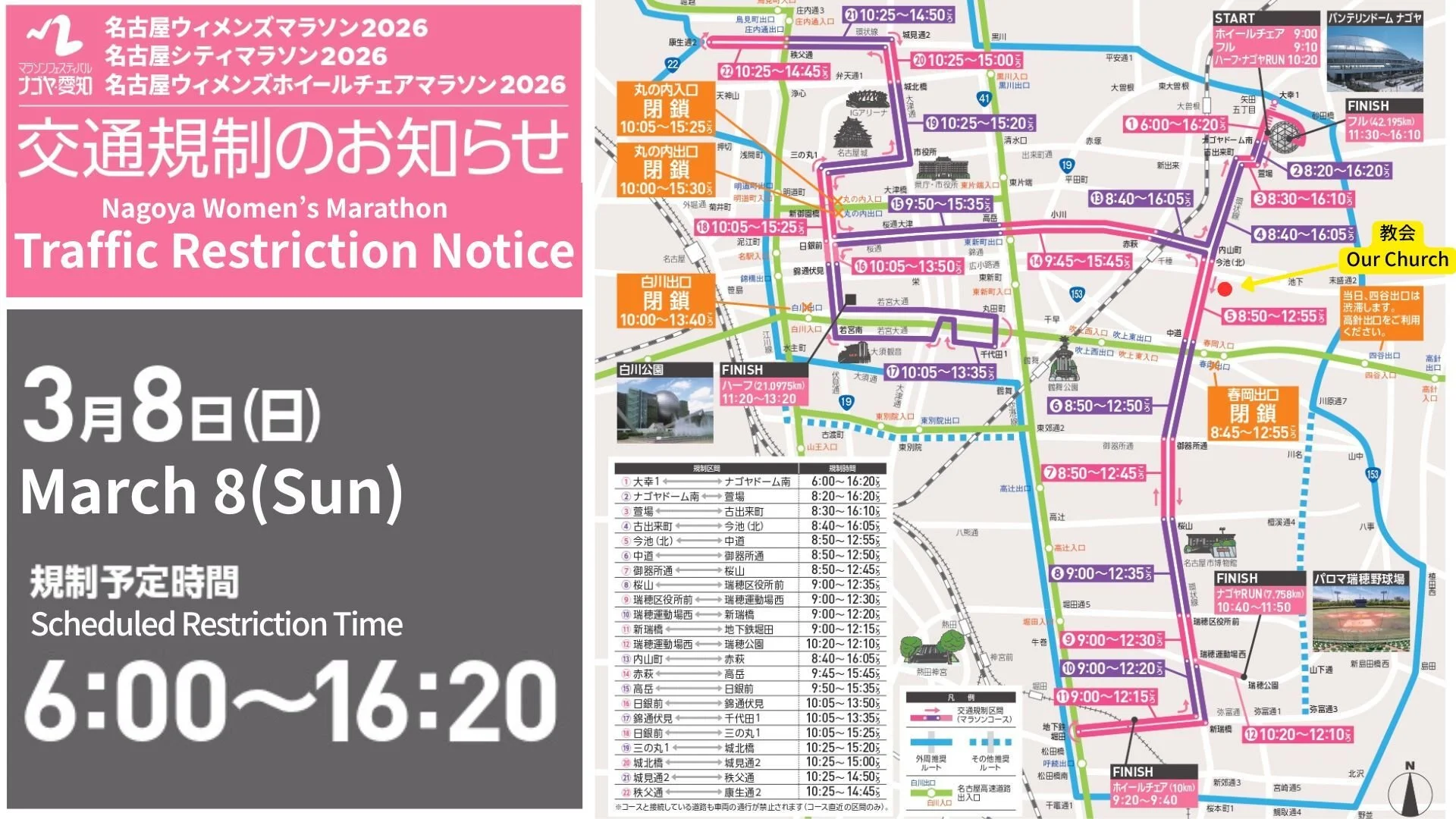 On Sunday, March 8, the Nagoya Women’s Marathon will be held. There will be traffic restrictions around the church on that day.