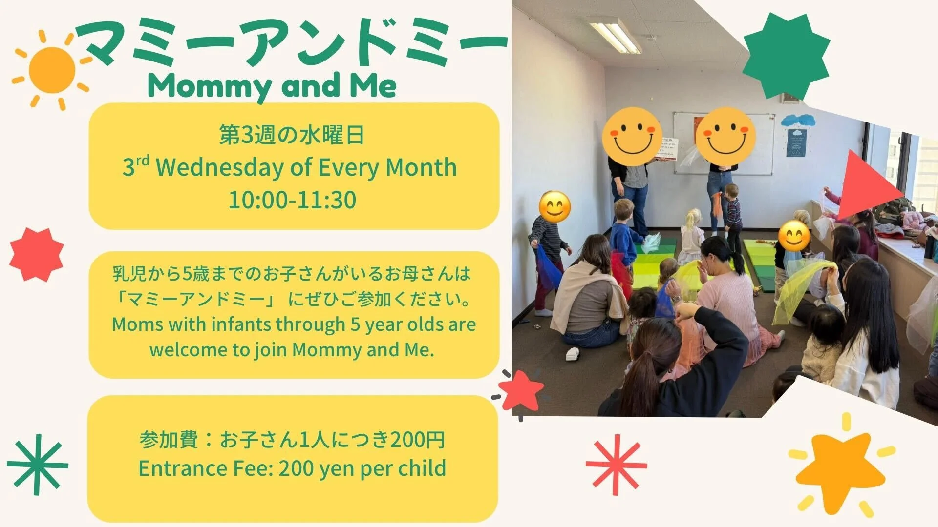 このバイリンガルの集まりは、毎月第三水曜日の10:00-11:00に開催されます。その後、希望される方はお弁当を持参のうえ11:45までのランチタイムにも参加できます。